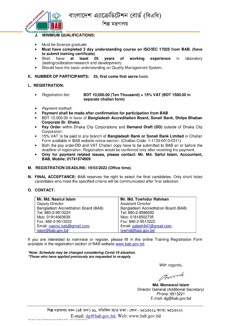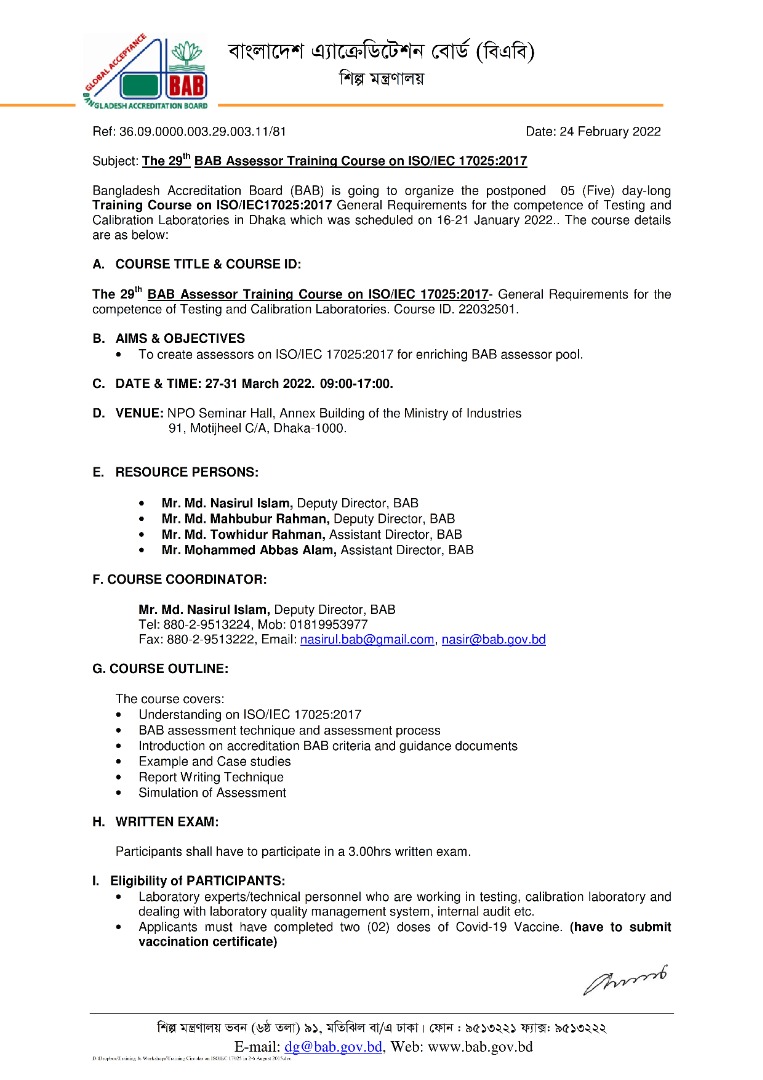 আইএসও/আইইসি ১৭০২৫ঃ২০১৭ এর ২৯ তম বিএবি এ্যাসেসর প্রশিক্ষণ কোর্স, ২৭-৩১ মার্চ ২০২২