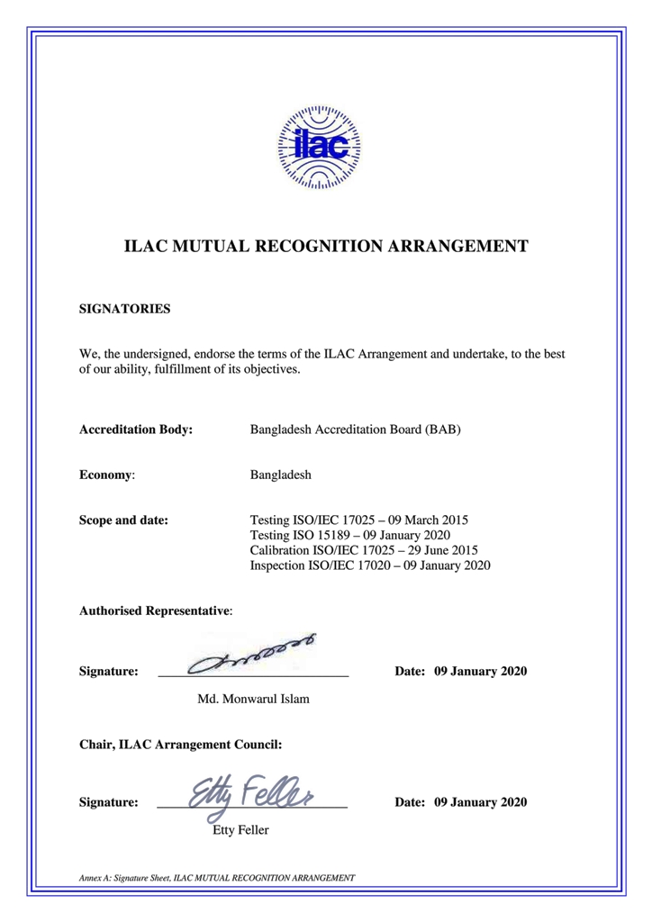 বাংলাদেশ এ্যাক্রেডিটেশন বোর্ড ২০১৫ সাল থেকে ইন্টারন্যাশনাল ল্যাবরেটরী এ্যাক্রেডিটেশন কো-অপারেশন এর (ILAC) পূর্ণ সদস্য পদ অর্জন এবং পরীক্ষণ ও ক্যালিব্রেশনের জন্য পারস্পরিক স্বীকৃতি চুক্তি (MRA) স্বাক্ষর করেছে।যার ফলে এ্যাক্রেডিটেড ল্যাবরেটরী কর্তৃক ইস্যুকৃত রির্পোট এর বিশ্বব্যাপী গ্রহণযোগ্যতা বৃদ্ধির মাধ্যমে বাণিজ্যে কারিগরি বাধা দূরীকরণ সহ দ্বিতীয়বার পরীক্ষণ, সময় ও অর্থ, ইত্যাদির অপচয় রোধ করা সম্ভব হচ্ছে